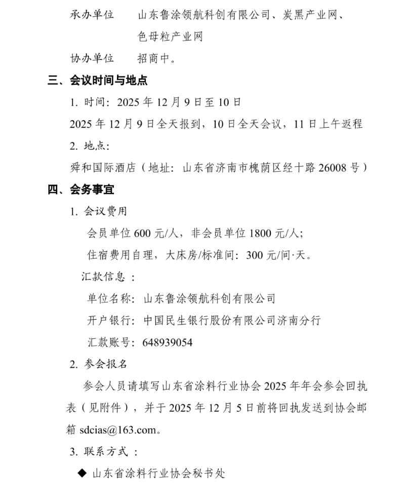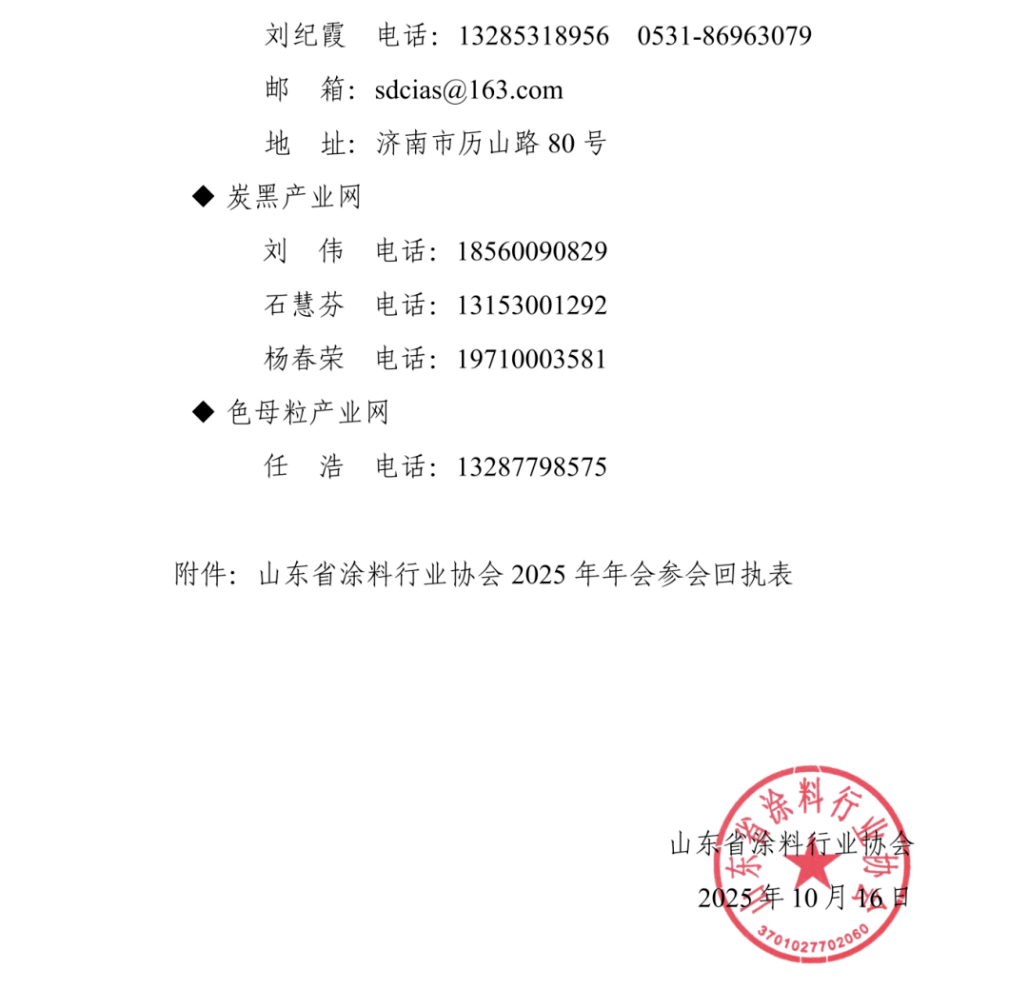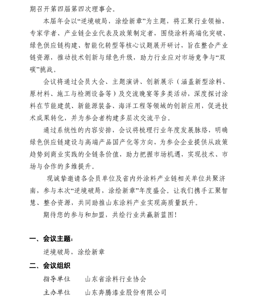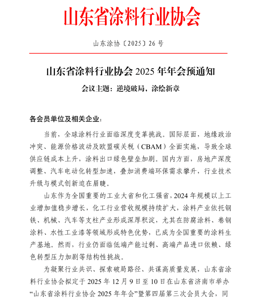 “山东省涂料行业协会2025年年会”暨第四届第三次会员大会定于2025年12月9日至10日在山东省济南市举办,同期召开第四届第四次理事会。本届年会以“逆境破局,涂绘新章”为主题,旨在整合产业链资源,推动技术创新与绿色升级,助力行业应对市场竞争与“双碳”挑战。