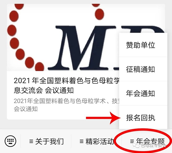 ③ 之后,您可以选择点击右下角“年会专题”菜单,点击其中的“报名回执”选项