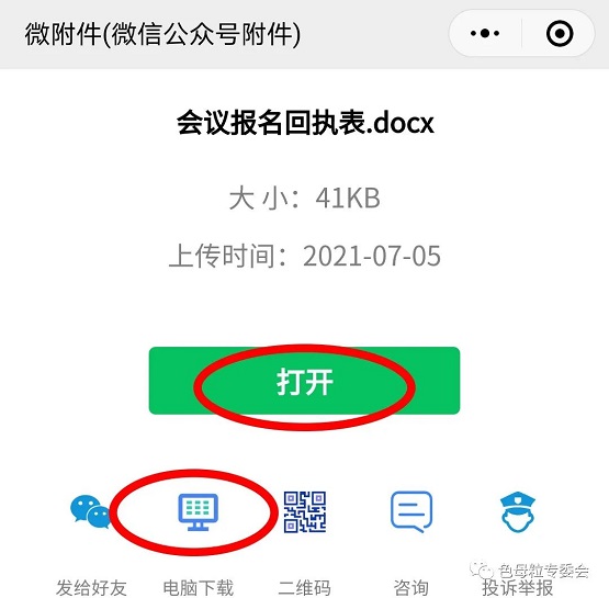 ④ 点击后,系统自动跳转至“微附件”小程序,可点击“打开”在线浏览并保存,也可点击"电脑下载"或“发给好友