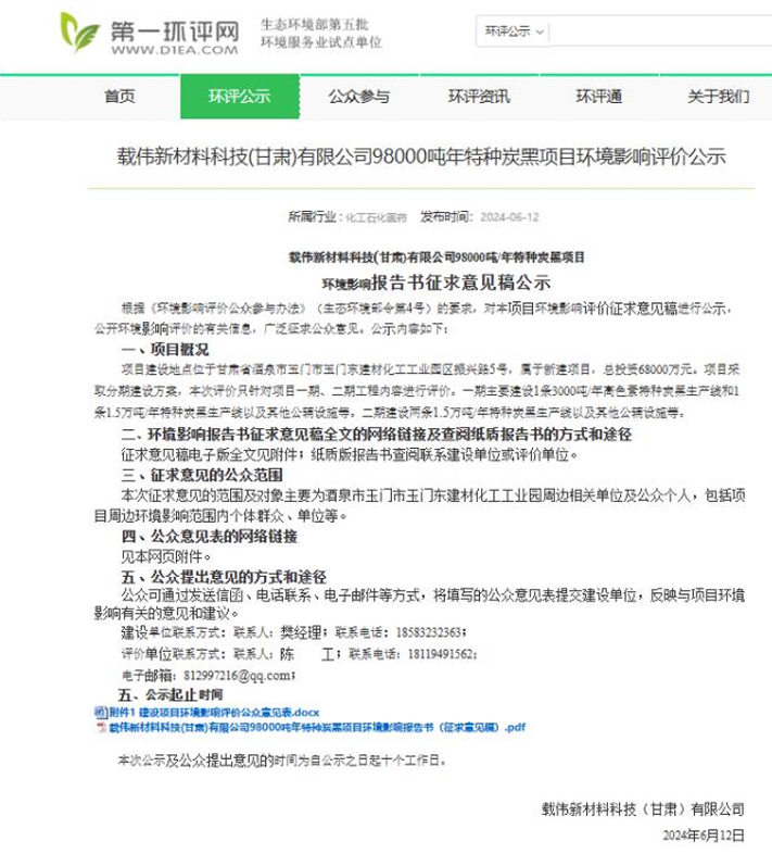 载伟新材料科技(甘肃)有限公司98000吨/年特种炭黑项目环境影响报告征求意见稿第二次公示原文显示:“项目建设地点位于甘肃省酒泉市玉门市玉门东建材化工工业园区振兴路5号, 属于新建项目,总投资68000万元。项目采取分期建设方案,本次评价只针对项目一期、二期工程内容进行评价。一期主要建设1条3000吨/年高色素特种炭黑生产线和1条1.5万吨/年特种炭黑生产线以及其他公辅设施等。二期建设两条1.5万 吨/年特种炭黑生产线以及其他公辅设施等。”