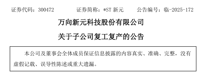 2024 年 12 月 4 日,万向新元率先发布《关于子公司临时停产的提示性公告》,称经审慎评估,为实现成本管控、提升生产效率及保障股东权益,决定让全资子公司万向新元(宁夏)智能环保科技有限公司(下称 “宁夏新元”)进入临时停产阶段。