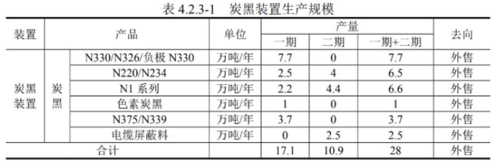一期工程设置5条生产线,产能为17.1万吨/a炭黑;二期工程新增3条生产线,新增炭黑产量10.9万吨。