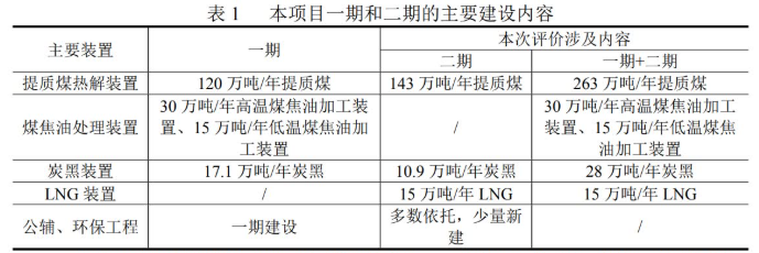 项目分两期建设,全厂建设产能为28万吨/年炭黑生产装置、263万吨/年提质煤热解装置、30 万吨/年高温煤焦油加工装置、15万吨/年低温煤焦油加工装置、15万吨/年LNG及配套公辅设施及环保工程。其中,一期工程已编制了环境影响评价报告;因项目为上下游产业链式,因此本次评价对二期工程和二期工程建设后的内容,进行评价。