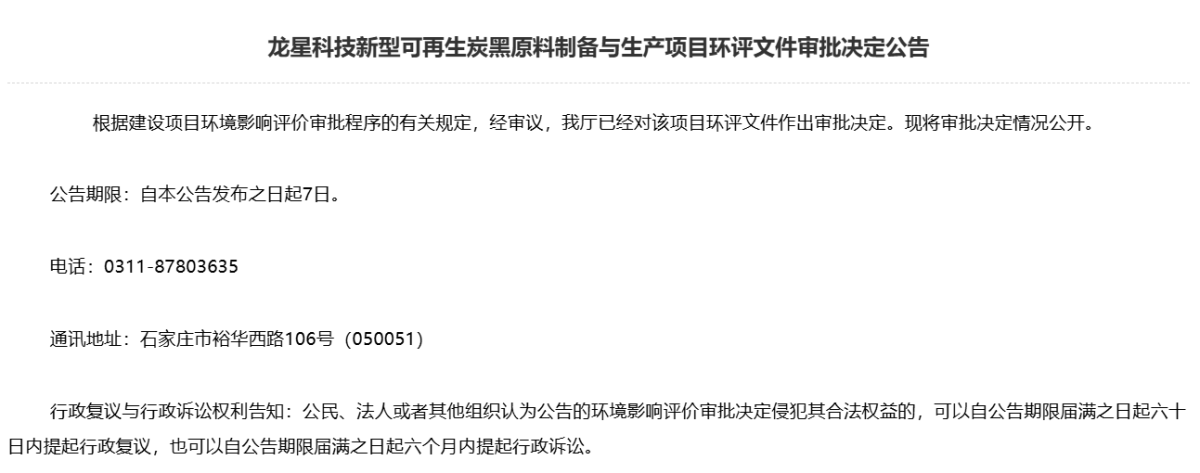 12月12日,龙星科技新型可再生炭黑原料制备与生产项目环评文件获批复。