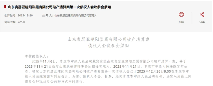 2025年11月21日,枣庄市中级人民法院发布公告,确定山东奥瑟亚建阳炭黑有限公司破产清算案第一次债权人会议于2025年12月26日9:00在枣庄市中级人民法院第四审判庭召开。