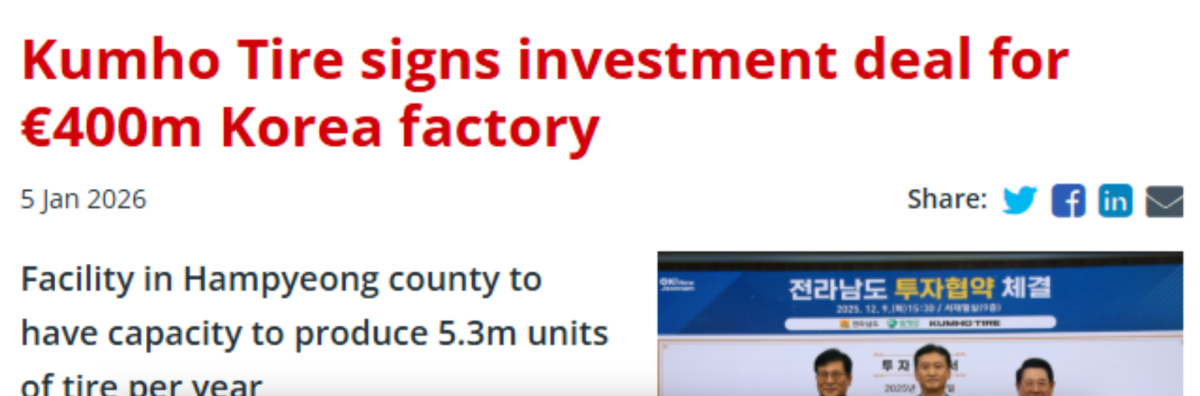 近日,锦湖轮胎对外宣布,已正式签署投资协议,计划在韩国西南部咸平郡的Bitgreen工业园区打造一座全新的轮胎制造厂。