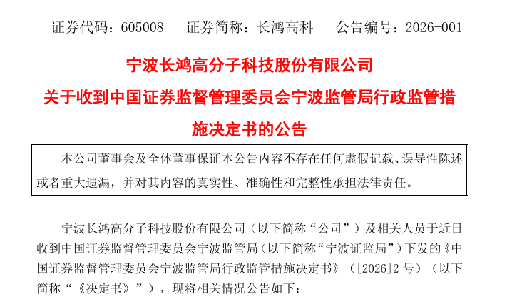 【炭黑产业网】1月19日消息,1月16日晚,宁波长鸿高分子科技股份有限公司(简称“长鸿高科”)发布公告,称公司及董事长陶春风、董事会秘书白骅、时任财务总监胡龙双收到中国证券监督管理委员会宁波监管局(以下简称“宁波证监局”)下发的行政监管措施决定书。