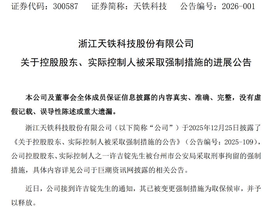 【炭黑产业网】1月19日消息,1月18日晚间,天铁科技(300587)发布公告称,此前被台州市公安局采取刑事拘留强制措施的公司控股股东、实控人之一许吉锭,现已变更强制措施为取保候审并已被释放。