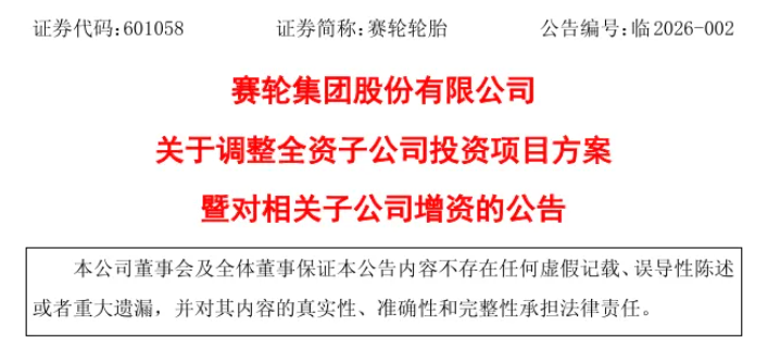 1月27日,赛轮集团股份有限公司发布关于调整全资子公司投资项目方案暨对相关子公司增资的公告。