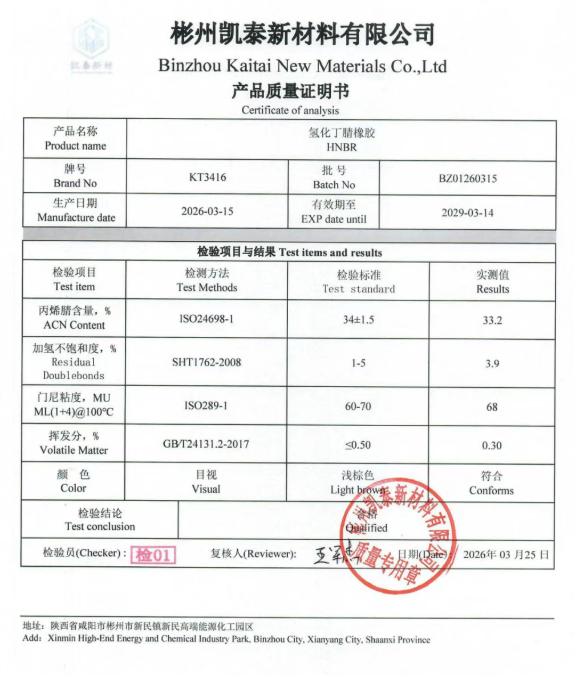 最新消息,彬州凯泰新材料有限公司自主研发生产的氢化丁腈橡胶KT3416牌号,现已顺利实现稳定量产和销售。