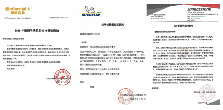 近日,轮胎行业迎来史上最密集、覆盖最广的一轮涨价潮,外资巨头与国内龙头集体调价,形成全行业 “涨价共振”,核心驱动直指天然橡胶、合成橡胶、炭黑等原材料及能源物流成本的持续攀升。截至4月下旬,超80家国内外轮胎企业密集发布涨价函,覆盖乘用车胎、卡客车胎(TBR)、内胎垫带等全品类,调价周期延伸至6月:国外龙头:普利司通 5 月 1 日起乘用车胎涨3%-5%;米其林 5 月 1 日起乘用车、轻卡胎单条涨15-30元;倍耐力、德国马牌、优科豪马等同步跟进,涨幅集中3%-5%。