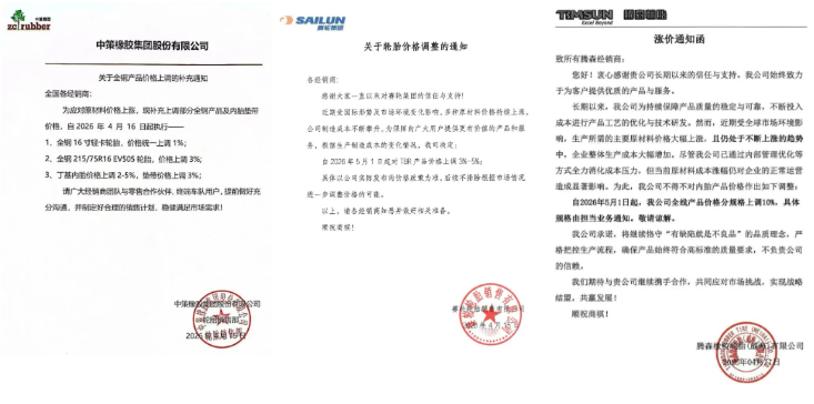 本轮涨价自3月启动首轮调价,部分企业甚至在单月内两次上调价格。整体涨幅2%-8%,内胎、特种胎涨幅超10%,呈现 “外资领涨、内资全跟、全品类覆盖” 的态势。