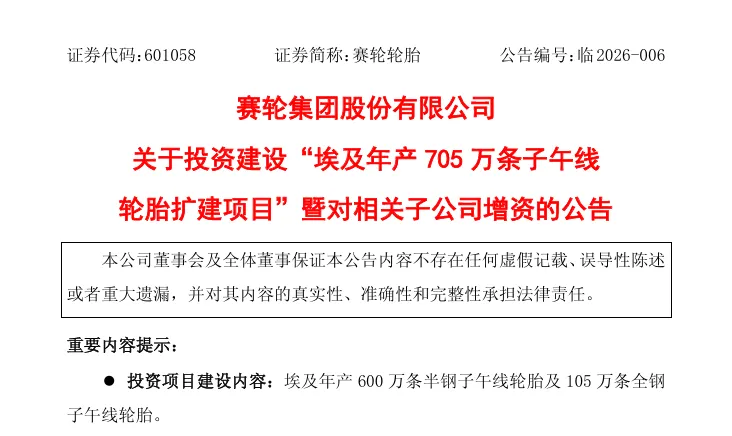 4月21日,赛轮轮胎发布公告,计划在埃及新建年产705万条子午线轮胎扩建项目。