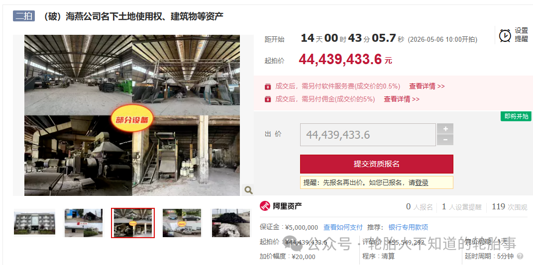 【炭黑产业网】4月24日消息,4月20日,四川内江圣典拍卖有限公司对外公布了一则拍卖公告,内容显示四川省隆昌海燕橡胶有限公司(简称“海燕橡胶”)的全部资产将于5月6日在阿里拍卖平台上迎来第二次公开拍卖。此次起拍价较首次拍卖大幅降低,定为约4443.94万元,降幅超过1000万元,此举引发了业界对于这家老牌轮胎企业未来走向的广泛关注。