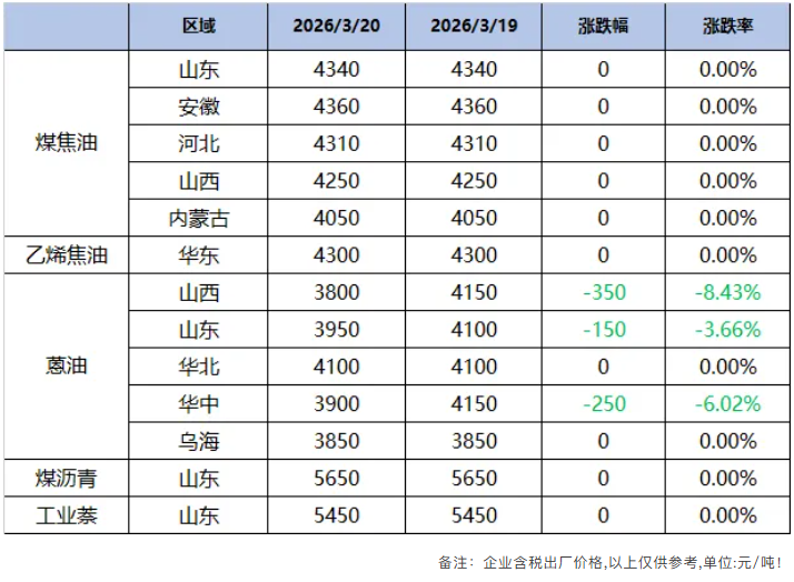 ② 煤沥青等主要产品新单仍在商谈中,跟跌可能性较大;蒽油跌幅在150-350元/吨,深加工行业利润承压。