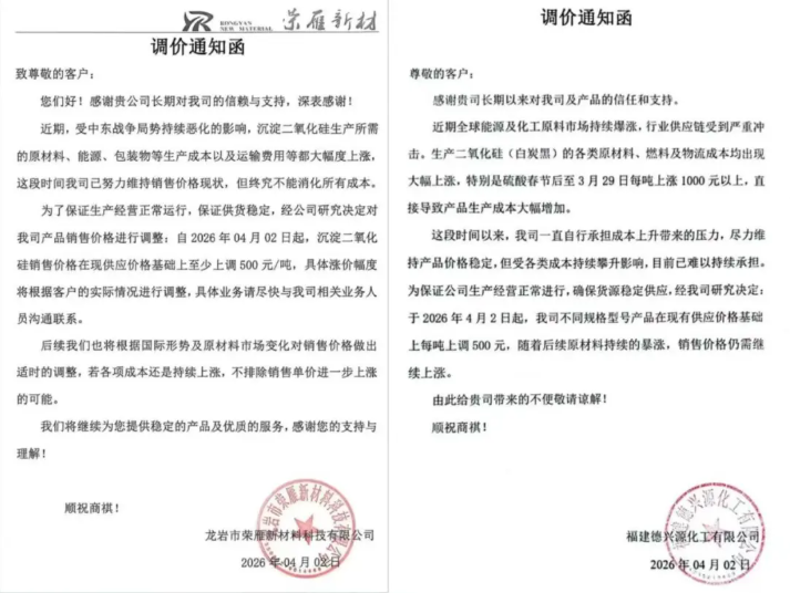 部分白炭黑企业表示,受原料供应紧张与成本端持续上行影响,生产成本显著增加。 自2026年04月02日起,沉淀二氧化硅销售价格在现供应价格基础上至少上调500元/吨:
