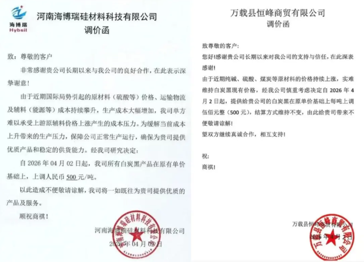 地缘政治冲突持续,全球能源与化工大宗商品价格波动加剧,带动纯碱、硫酸、煤炭等核心原材料成本持续上行。为保障生产经营稳定,多家白炭黑企业相继发布调价通知,上涨500元!