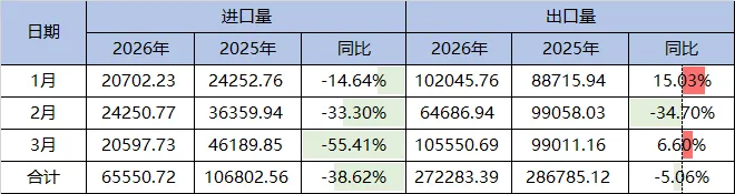 春节后下游需求偏弱、进口刚需下降,叠加地缘政治、海运成本增加及海外工厂检修限产,共同导致进口量下滑。