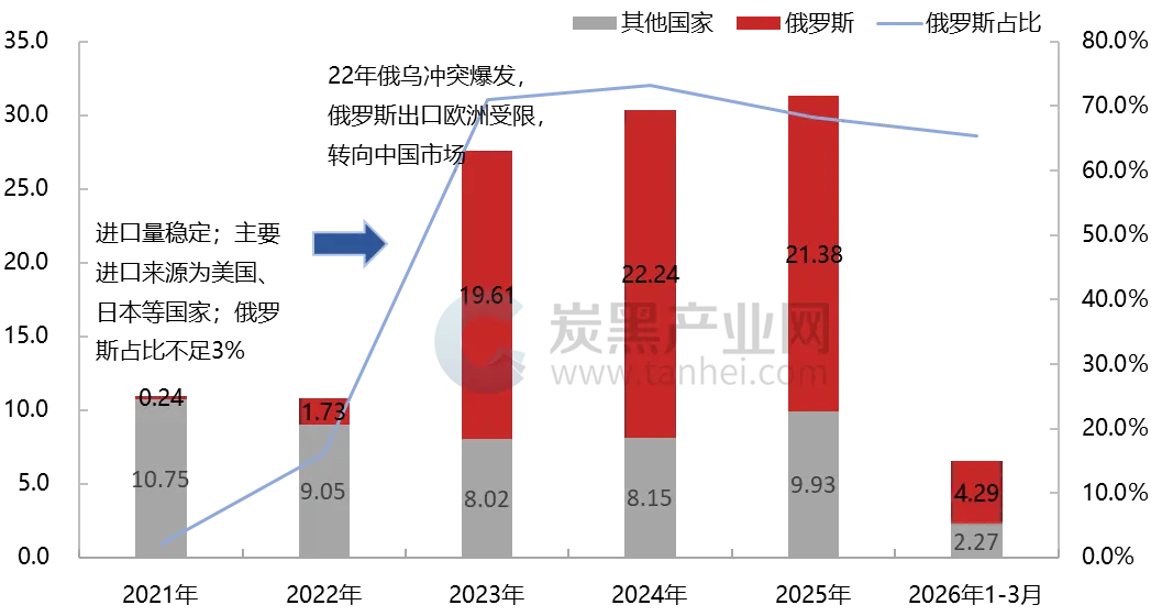 2026 年 3 月炭黑进口量减少,主因是国际价格大涨、内外价差扩大。中东冲突推高油价,海外油系炭黑成本上升,卡博特两次上调橡胶炭黑价格,累计涨幅 2300 元 / 吨,特种炭黑亦上调 1800 元 / 吨。