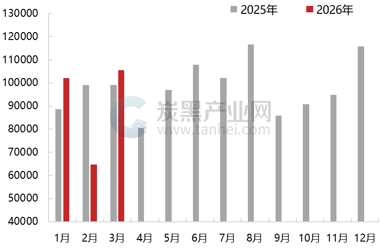 3月炭黑出口量为105550.685吨,环比增加63.17%,同比增加6.60%,出口均价为998.22美元/吨。2026年1-3月总出口量为272283.385吨,同比减少5.06%。