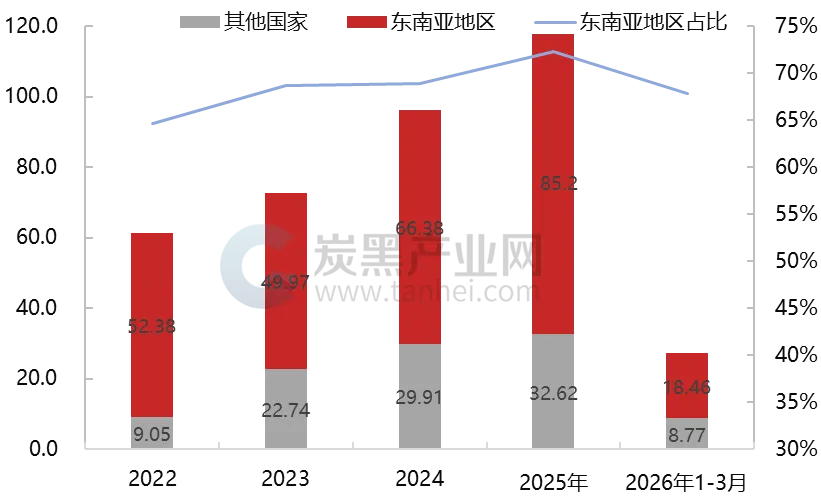 2026 年 3 月中国炭黑出口大幅增长,主要受国内外成本价差扩大、产品性价比突出带动。东南亚产能持续扩张,中东、欧洲因地缘因素转向中国采购,叠加外贸环境向好,多重因素共同推动出口量显著回升。从海关进出口数据来看,炭黑主要出口到东南亚地区,国内轮胎企业出海建厂,泰国、越南、印尼等地区轮胎产能持续扩张,对中国炭黑进口依赖度居高不下。其中,3月出口到东南亚的炭黑总量达184645.225吨。