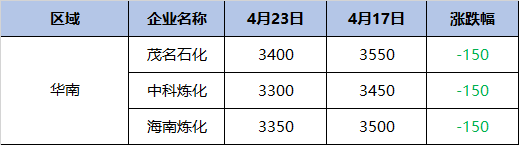 4月24日,中石化华南乙烯焦油价格下跌150,中科炼化价格为3300,海南炼化价格为3350,茂名石化价格为3400。