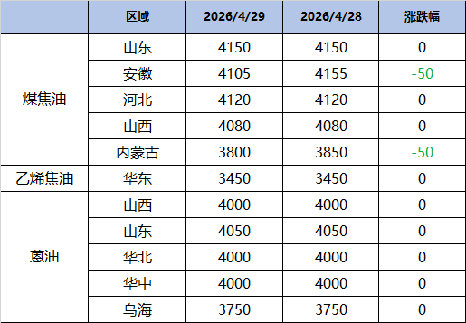 原料煤焦油接连三周缓幅下行,但是实际成交价格偏低位。华东区域乙烯焦油下跌至3450元/吨。