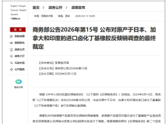 商务部公告2026年第15号 公布对原产于日本、加拿大和印度的进口卤化丁基橡胶反倾销调查的最终裁定根据《中华人民共和国反倾销条例》(以下简称《反倾销条例》)的规定,2024年9月14日,商务部(以下称调查机关)发布2024年第38号公告,决定对原产于日本、加拿大和印度的进口
